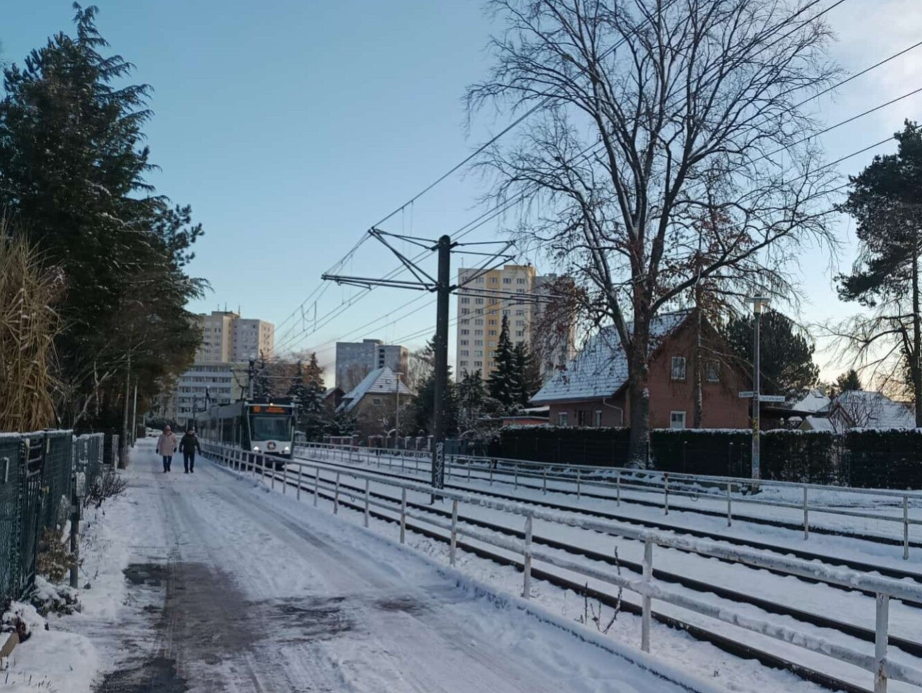 Bei bestem Winterwetter ging es am Bahnhof Medienstadt Babelsberg los im Ortsteil Am Stern. Erbaut zwischen 1970 und 1980 zur Namensgebung "Stern" kommt es später noch. Es ging zuerst zum Schäfersee, allen bekannt als "Baggersee". Die ehemalige Kiesgrube entstand 1983 beim Bau vom Wohngebiet Am Schlaatz. Weiter an der Evangelischen Stern Kirche vorbei, zum Johannes Kepler Platz, das Zentrum des Wohngebiets. Es ging zum Kiezbad und zum Sportplatz von Fortuna Babelsberg, Weiter am Leibnitz Gymnasium vorbei über die Galileistraße zum Bürgerhaus "Sternzeichen". Zur Nuthestraße zwischen der Schnellstraße und Wohnblöcken vorbei zum Jagdschloß. Am anliegendem Hochhaus konnte ich noch ein Foto über das Waldgebiet machen.